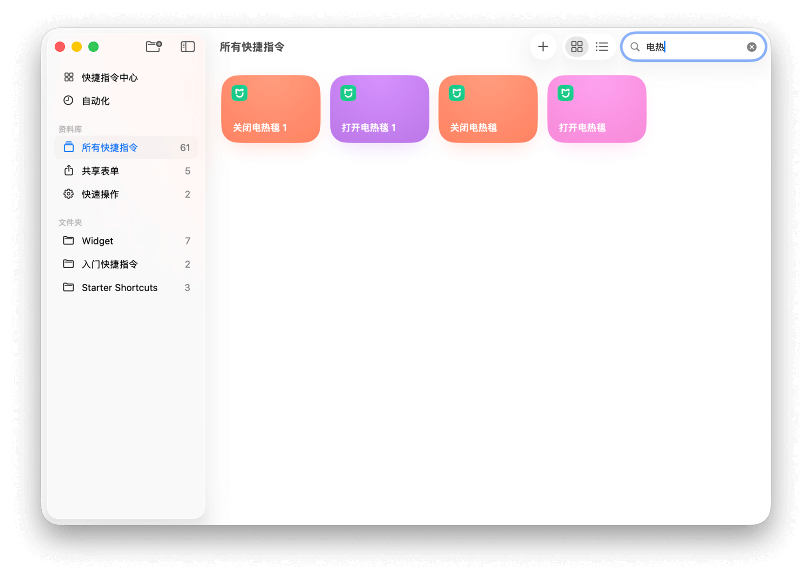 但你可能已经想到了:如果快捷指令数量太多,寻找起来会不会很麻烦?为了解决这个问题,快捷指令在顶部右侧提供了搜索栏,方便你快速查找。