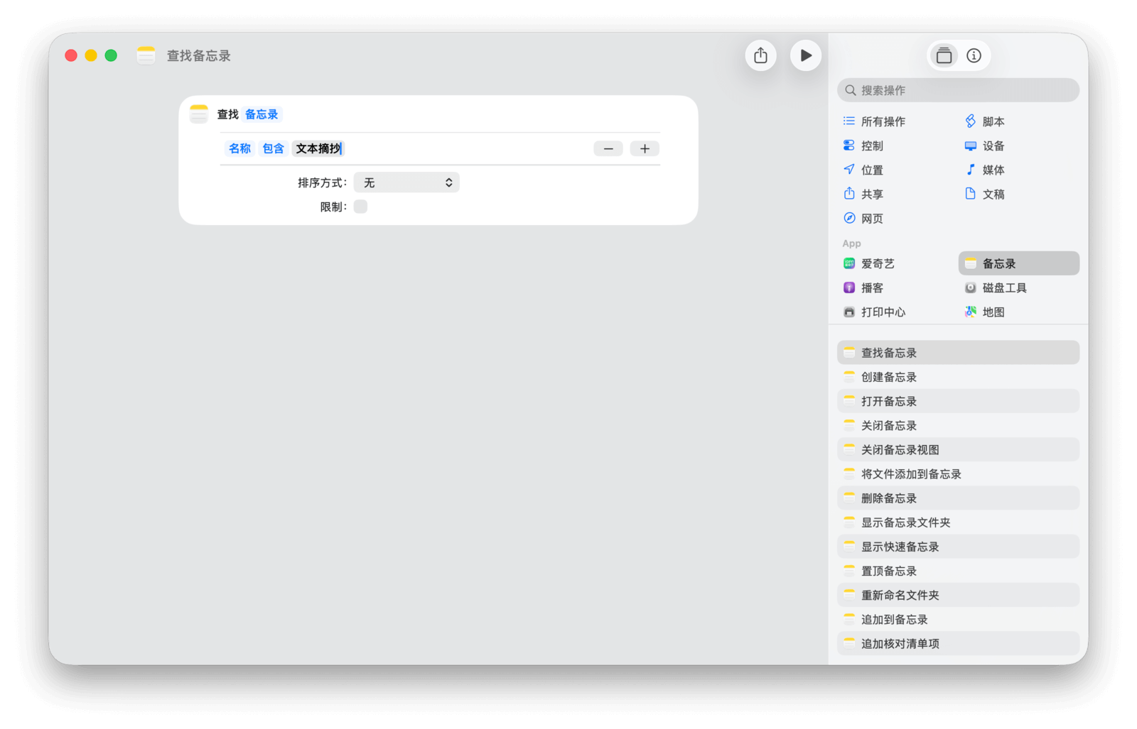 添加第一个动作后,我们需要设定过滤条件。由于刚才创建的备忘录标题是「文本摘抄」,所以这里的过滤条件应设为「名称 包含 文本摘抄」。