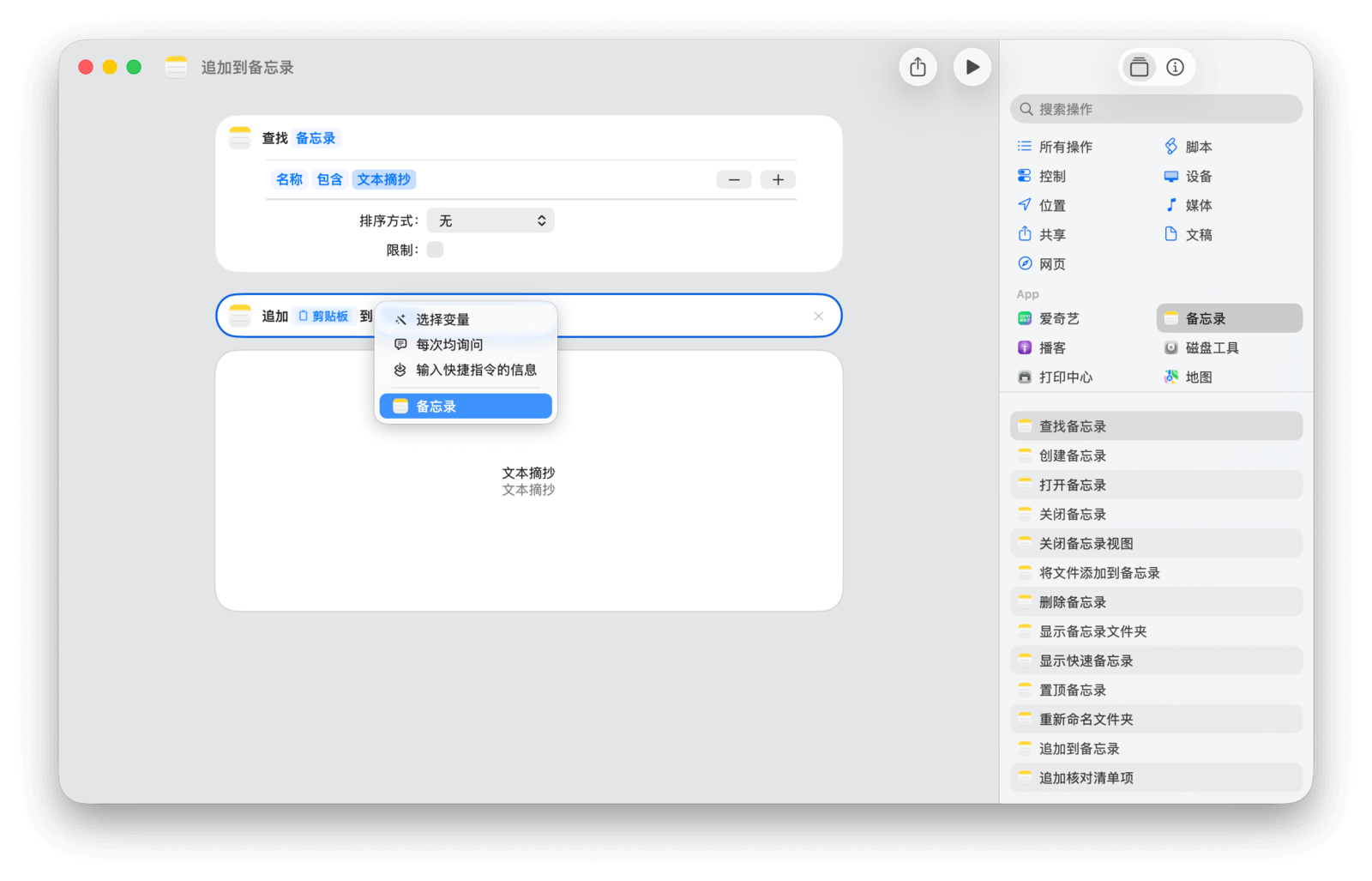 我们以制作「笔记摘抄」快捷指令为例,看看如何将剪贴板文本一键追加到备忘录中。