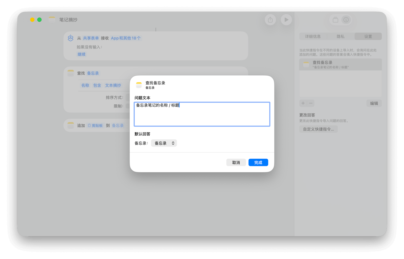 修改快捷指令后,再返回「导入问题」页面,此时就可以选择刚才的「文本」动作作为询问内容了。此处作为演示,我们将问题设为「你的摘抄备忘录的标题是什么?」,并将默认回答设为「文本摘抄」。