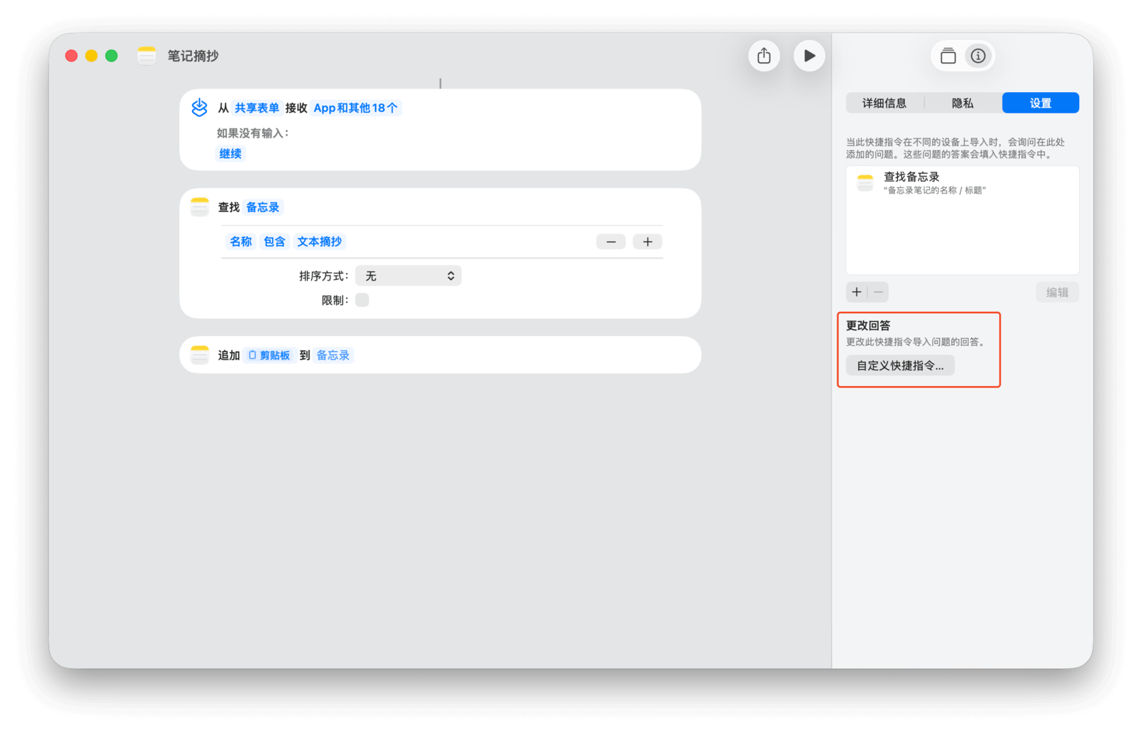 以上是最常见的分享方式。但如果快捷指令中包含个人信息,或某些配置因人而异,这种简单的分享方式就不够灵活了。好在快捷指令提供了「导入问题」功能来解决这个问题。