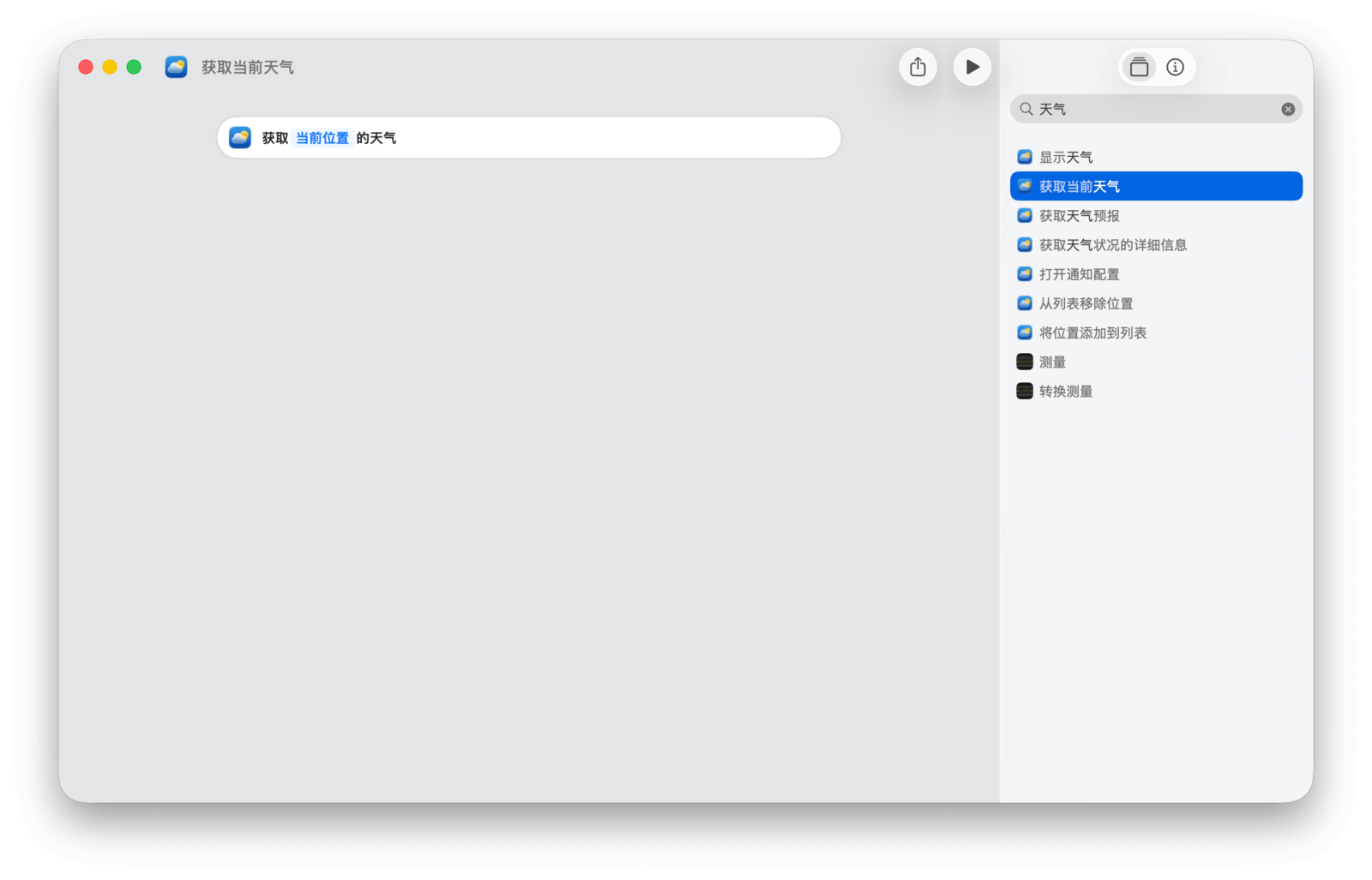 快捷指令提供了天气 App 的相关动作,只需简单构建即可实现该功能。