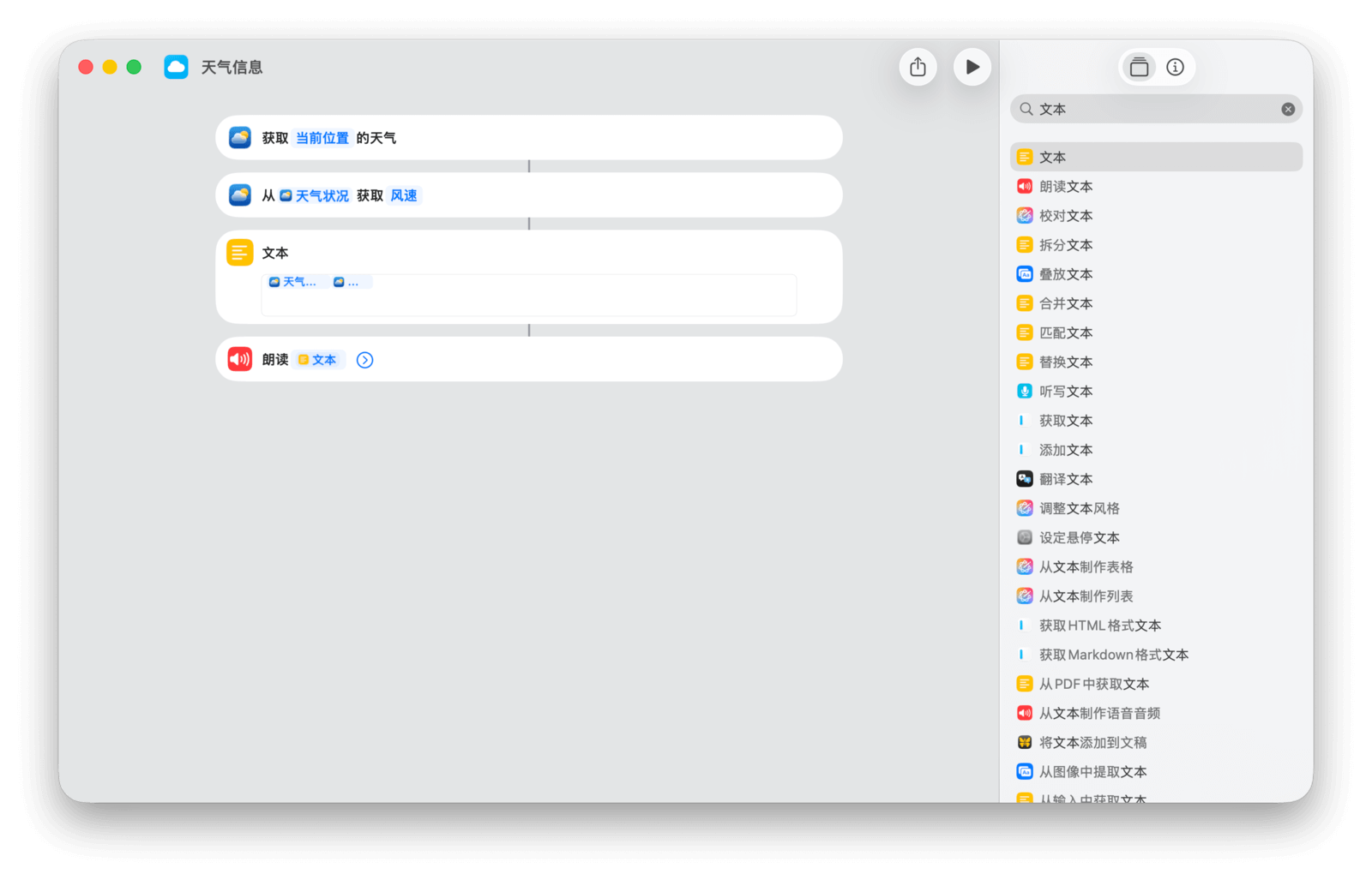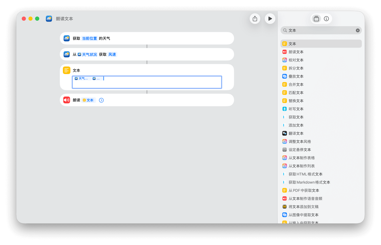 但此时如果测试运行,你会发现它只播报了风速,而没有播报天气摘要。这是因为「朗读」动作默认只会读取上一个动作的输出结果。要将两个信息合并播报,我们需要用到「文本」模块。