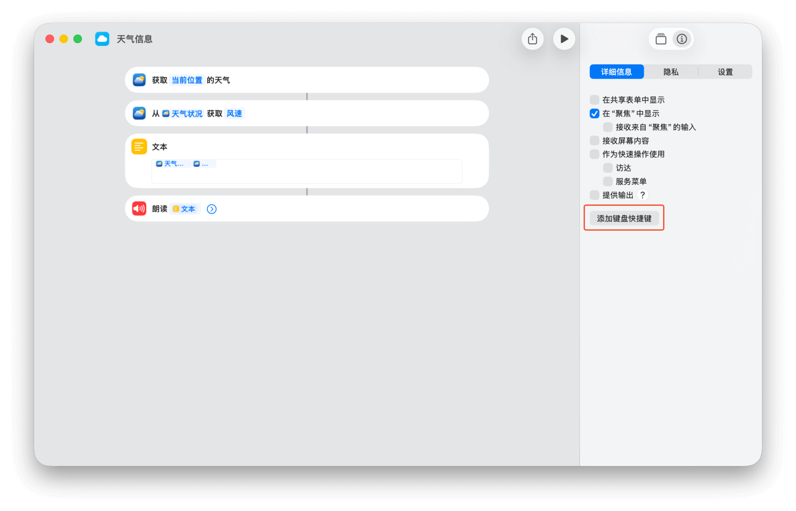 进入任一快捷指令的编辑界面,点击右侧边栏的「i」按钮,在「详细信息」标签页下点击「添加键盘快捷键」,即可为其录制专属快捷键。录制完成后,你就可以通过该快捷键直接运行对应的快捷指令。