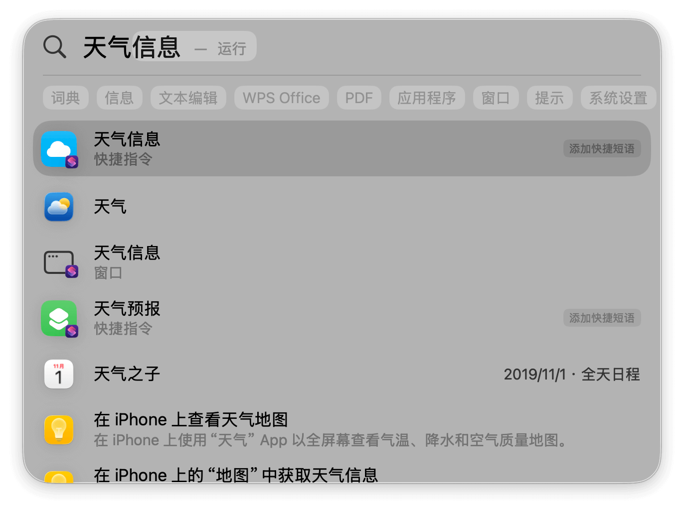 从 macOS 13 开始,聚焦搜索的能力得到进一步提升,可以直接搜索并运行快捷指令。你只需在聚焦窗口中输入快捷指令的关键词,在结果列表中选中它,按下回车键即可运行。