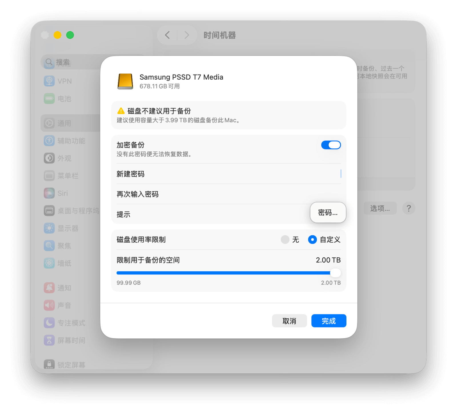 请注意,被选中的磁盘可能需要先抹掉数据,并格式化为指定格式,才能用作时间机器的备份磁盘。