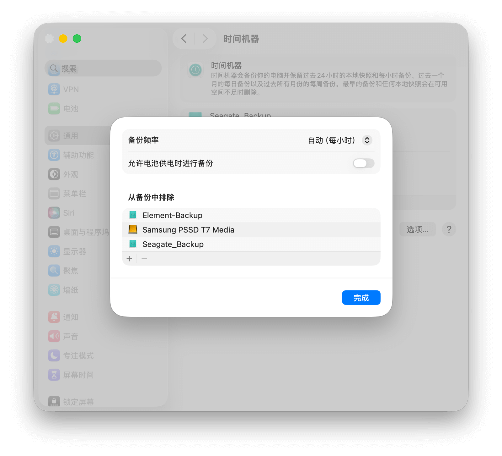 默认情况下,MacBook 只有在接入电源时才会进行自动备份。若想让它在使用电池时也进行备份,可以勾选「允许电池供电时进行备份」。