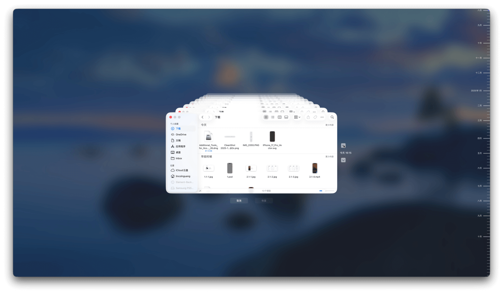 简单来说,「时间机器」App 能以访达窗口的形式,展示任意备份时间点的文件全貌。窗口右侧是一条时间轴,每个刻度都对应一次备份。