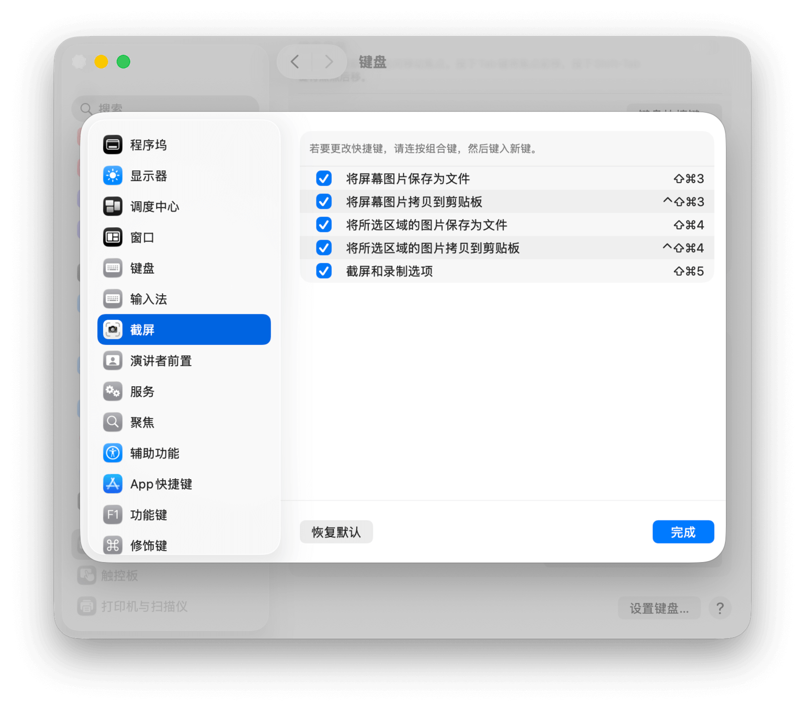 默认的截图快捷键需要同时用到多根手指,且键位分布较散。如果你不习惯这些默认设置,可以在「系统设置 > 键盘 > 键盘快捷键 > 截屏」中修改成你喜欢的快捷键。