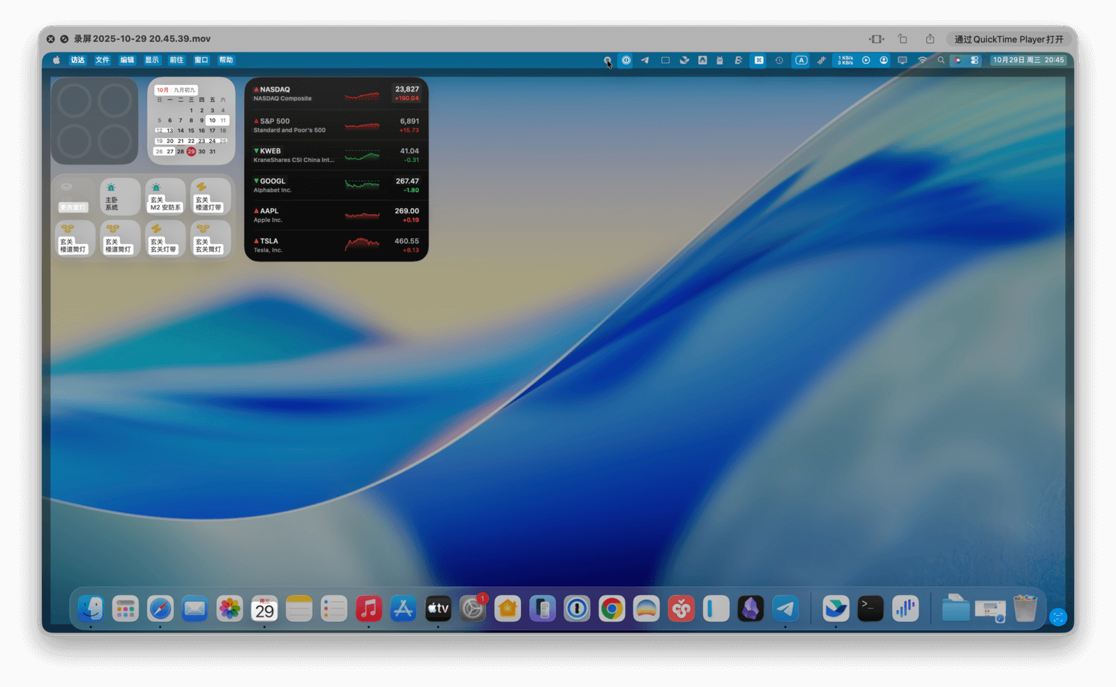 选择录屏模式后,点击工具栏上的「录制」按钮即可开始。录制期间,菜单栏上会出现一个「停止」按钮,点击即可结束录制。录制完成后,视频的缩略图会显示在屏幕右下角。