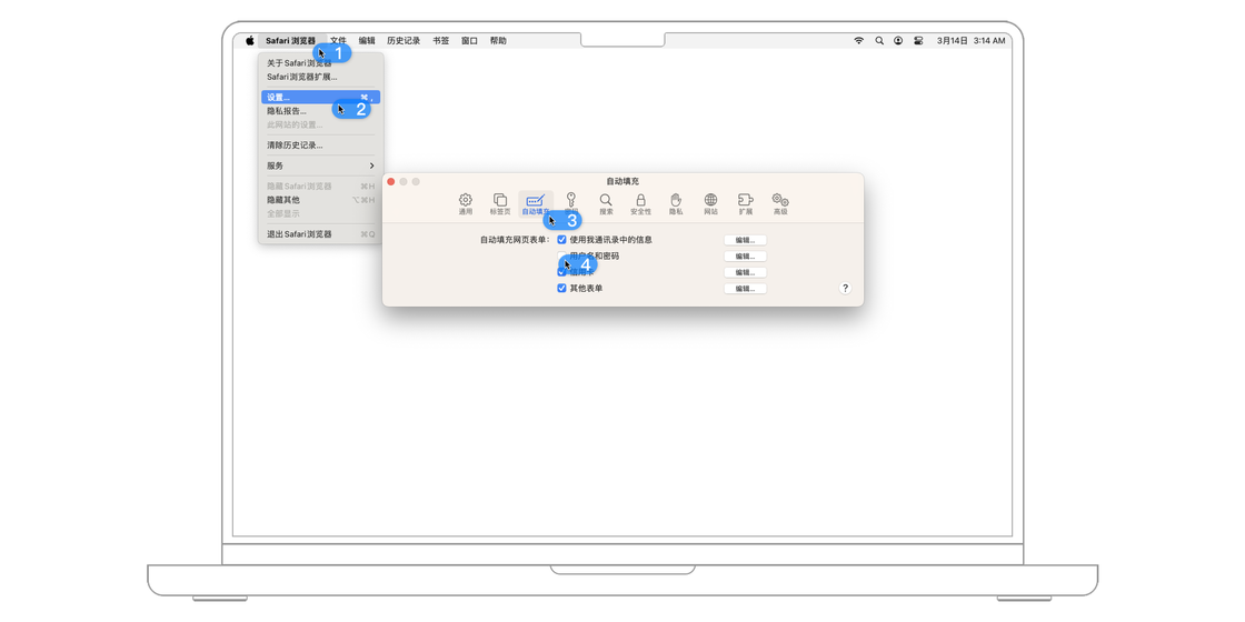 如果你针对 Safari 浏览器做自动填充密码的单独调整,可以在菜单栏里前往「Safari 浏览器 > 偏好设置 > 自动填写」然后勾选或者取消勾选「用户和密码」。