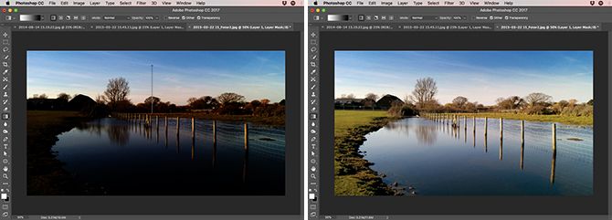 抓住直方图下方的中心选项卡,然后将其向右拖动,直到更好地露出天空-越暗,它看起来就越生动。忽略其余图像现在太暗的事实。单击确定继续。 下一步是对图层应用蒙版。 渐变工具介绍蒙版是Photoshop的基本组成部分,功能非常强大。它们使您可以无缝地将两个或多个层融合在一起。 简而言之,蒙版控制放置该遮罩的图层的不透明度。这是通过在蒙版上绘制白色和黑色区域来完成的:白色区域完全不透明,黑色区域完全透明。在黑色的地方,您可以直接在下面看到该图层的内容。 当您使用从白色到黑色的渐变色时,可以在顶层和下面可见的部分之间获得平滑的过渡。 添加图层蒙版选择重复和新编辑的图层后,单击“图层”面板底部的“添加图层蒙版”按钮。