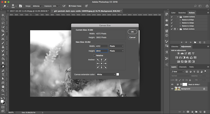 选择背景图层,然后转到图像>画布大小。我们要做的是增加放置图像的画布的大小。图像本身将保持相同大小,并且其后面的较大画布将产生边框效果。 在“画布大小”对话框的底部,将“画布扩展颜色”设置为“白色”。这将是框架的颜色,因此您可以选择黑色,也可以选择其他任何颜色。